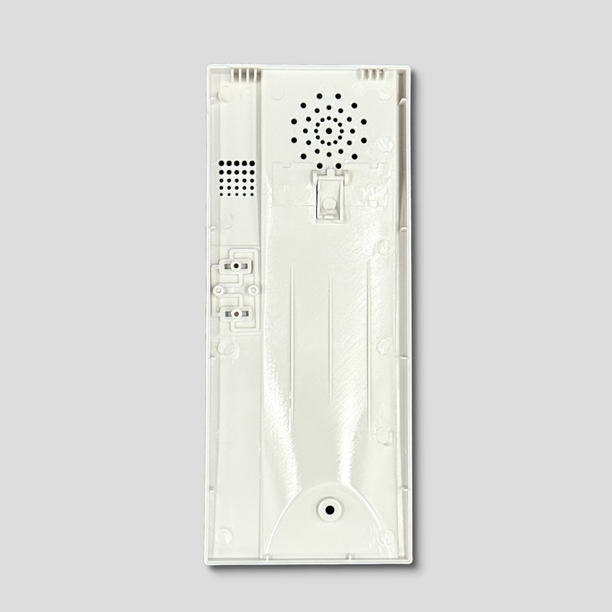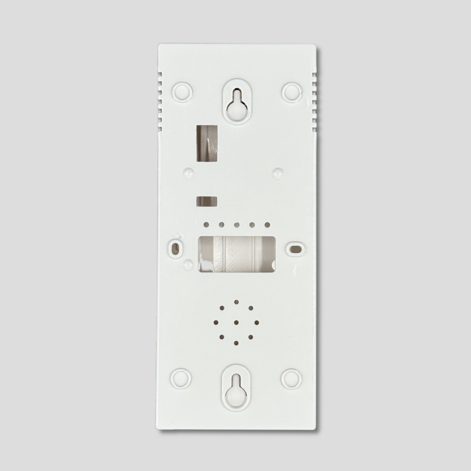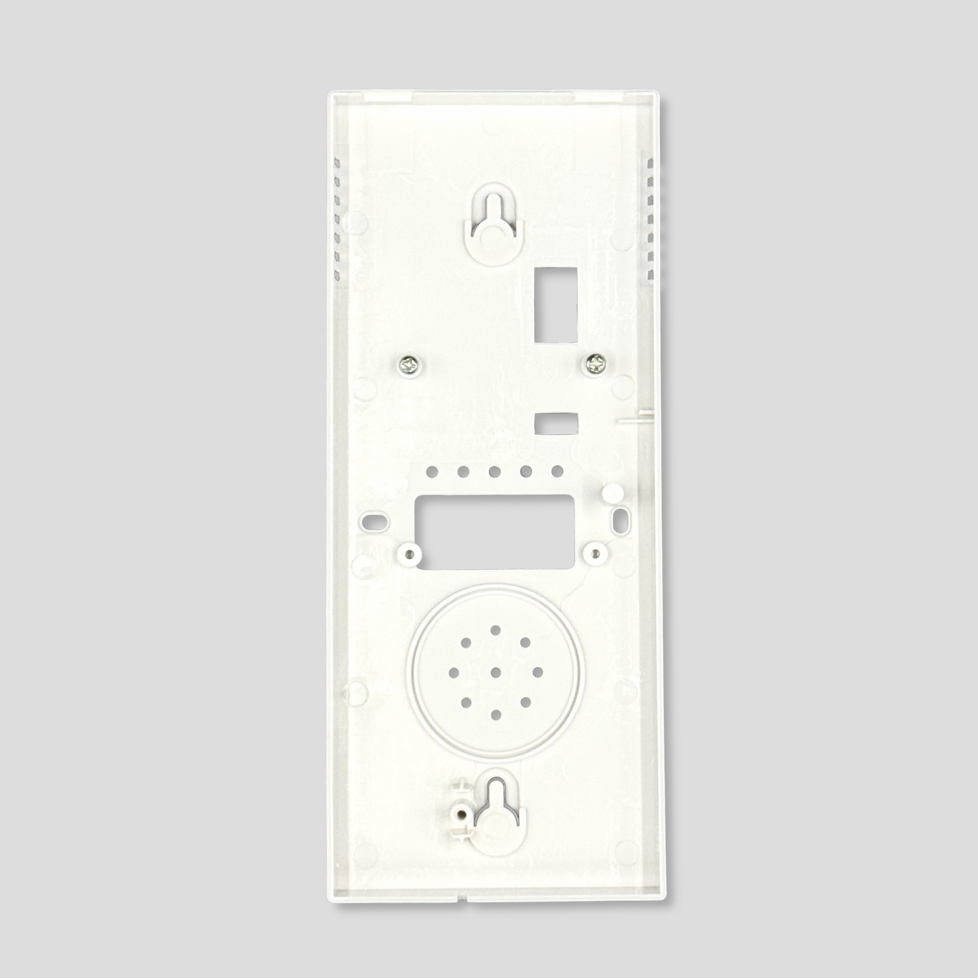 本ケースは、壁掛けでの使用を考慮し、取り付け用の開口部が設けられています。さらに、壁掛け用とは別に背面にも開口部があり、SIMカードの挿入や電源の供給をスムーズに行うことが可能です。加えて、表面にはLEDの設置などに活用できるスペースが確保されており、機能性と利便性を兼ね備えた設計となっています。